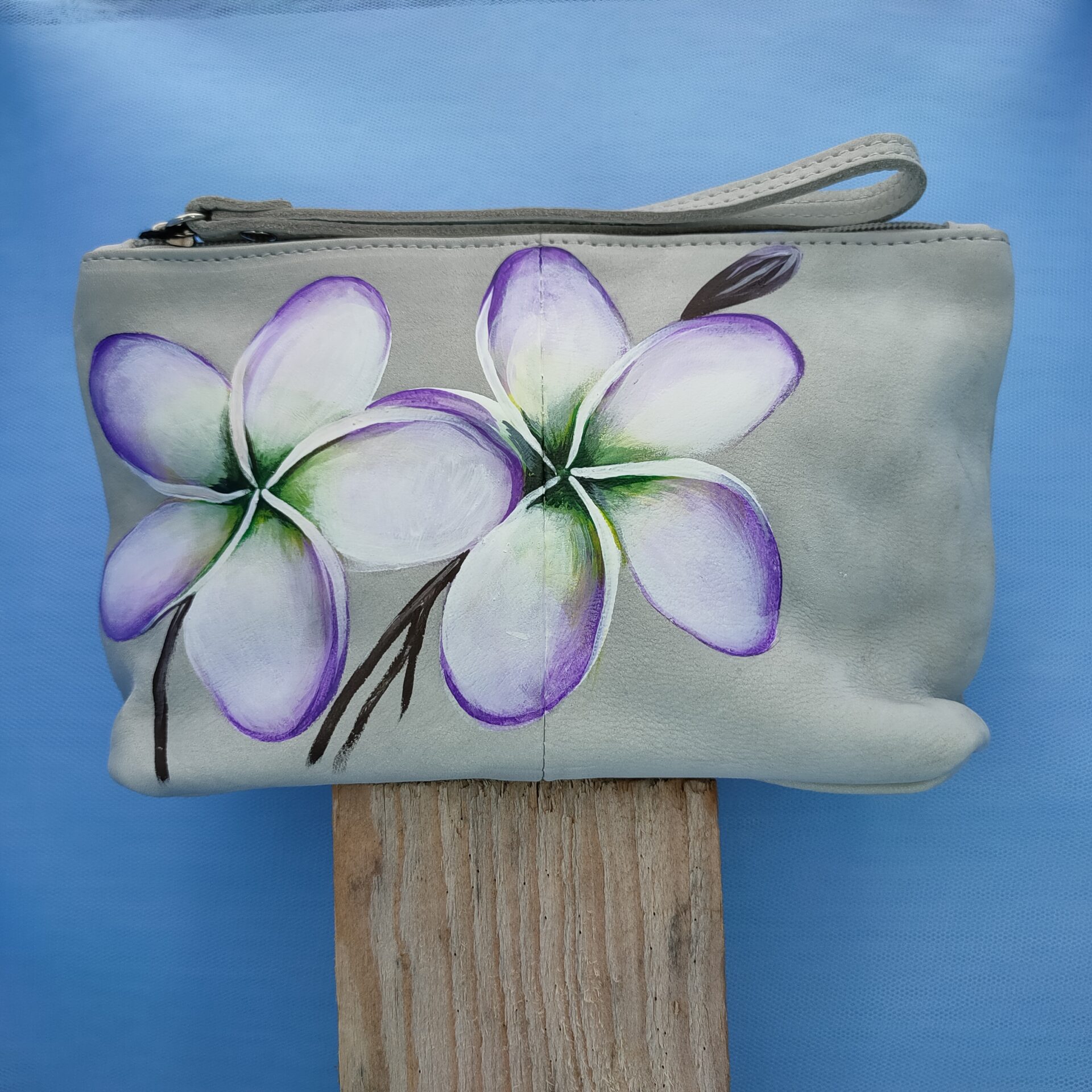 Borsa di pelle italiana dipinta a mano con fiore tropicale, personalizabile di colore e nome.