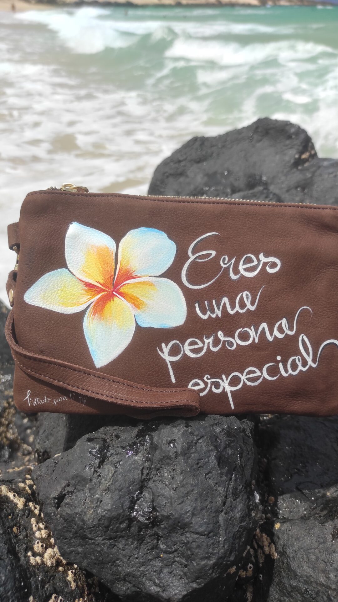 Bolso de piel genuina, pintada con flores y peronalizable de colores y nombre.